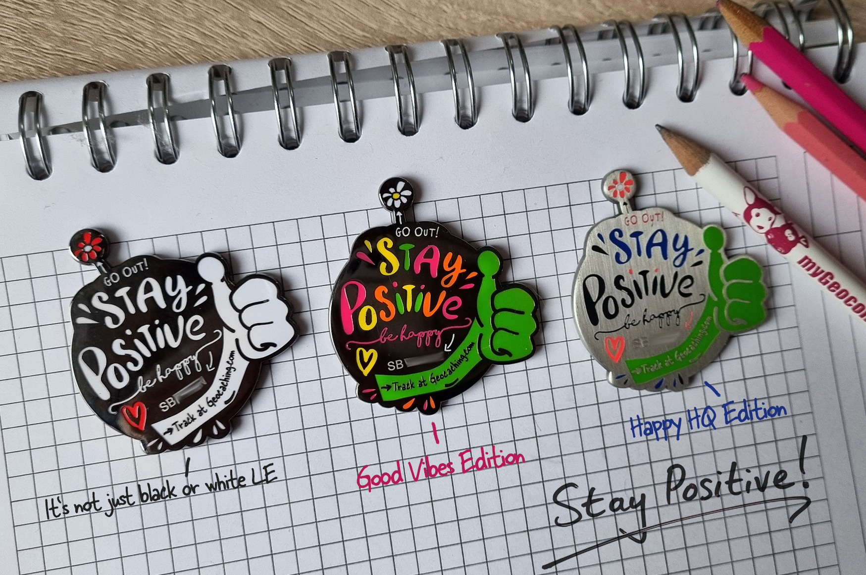 Als ich dann kürzlich den Geistesblitz "Positive Signal" hatte und ich den Charme dieses Wortspiels in Bezug auf Signal Frog (TM) erkannte, kam die Idee zuerst zu Papier und wurde bei Groundspeak zur Freigabe eingereicht. Die waren so begeistert von der Idee, dass sie sich eine eigene HQ-Editon gewünscht haben. So wurden es gesamt 3 inspirierende Editionen, die jede etwas sehr eigenes hat.